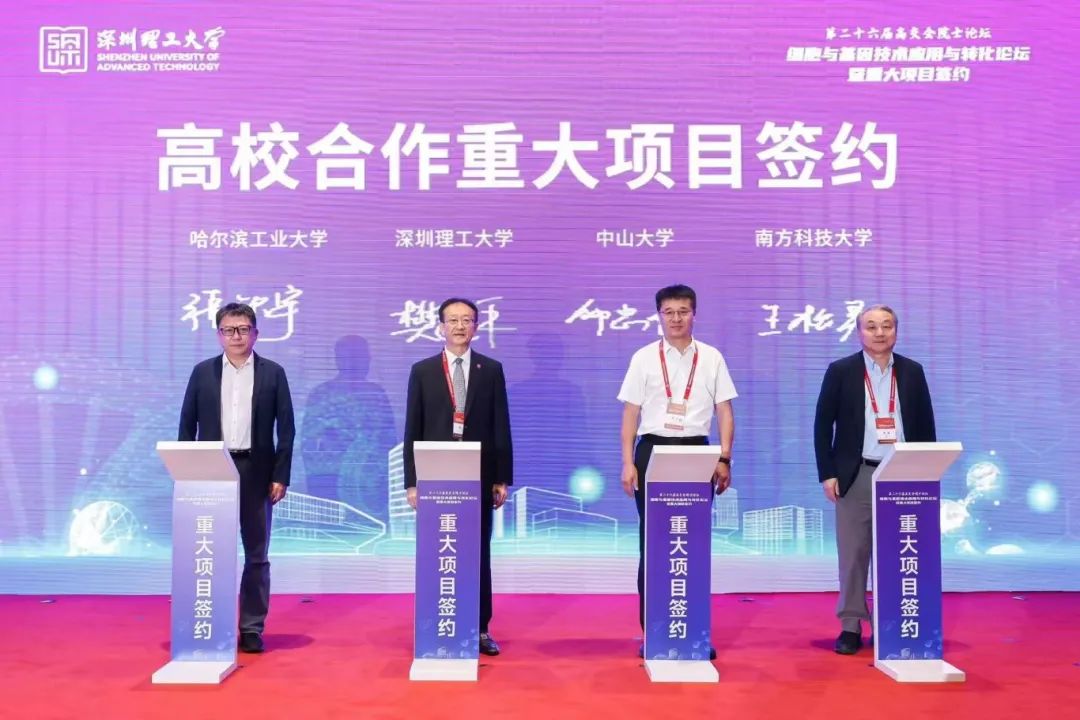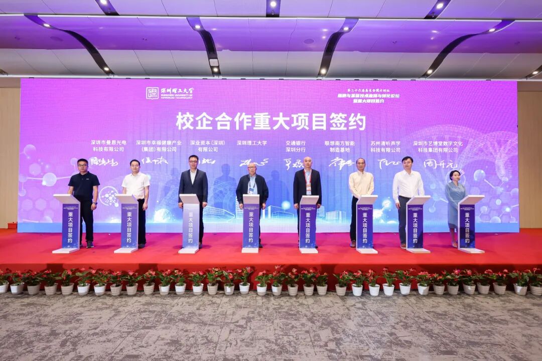 在下午举行的院士论坛上,深圳理工大学围绕拔尖创新人才联合培养、科技成果转移转化、产学研协同创新等与中山大学、哈尔滨工业大学、南方科技大学、深业资本(深圳)有限公司、科技园平台、基金等高校、企业机构代表完成16个重大项目签约,积极推进大学产业园建设,以城校共融、开放办学等举措驱动多主体协同创新,引领区域经济发展,聚力高质量协同育人。